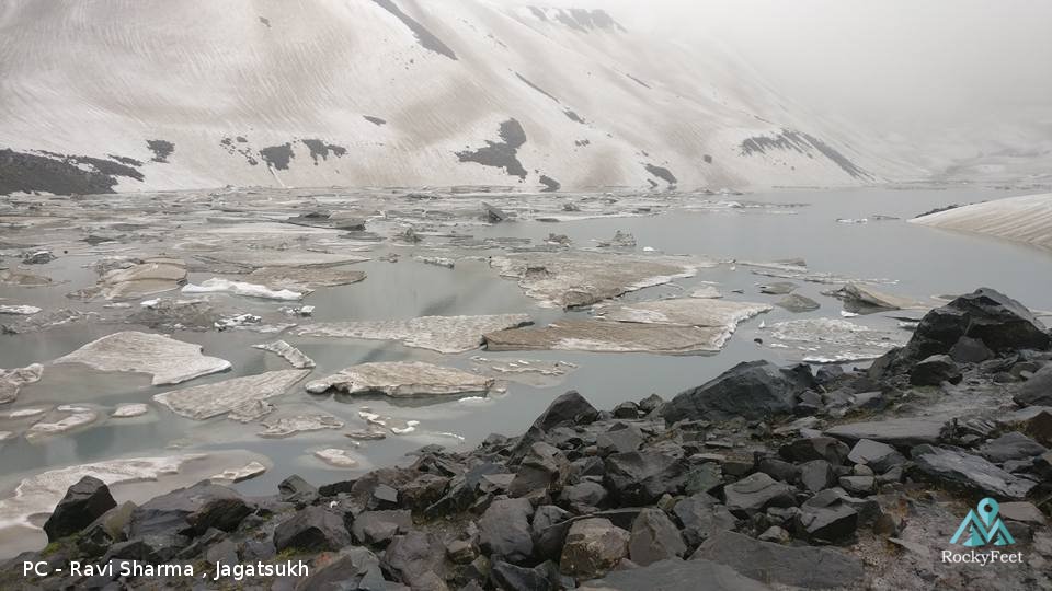 Next morning we made early start. Slow and gradual ascent up the bleak moraines,loose scree over the banks of large pristine lakes took us to the pass in 5 hours. There was good amount of snow on the long approach of the pass. On one side of the pass there is Lantern peak, on the other Thamsar peak. The lakes and these mountains are the source of Uhl river which we shall start to follow from here.