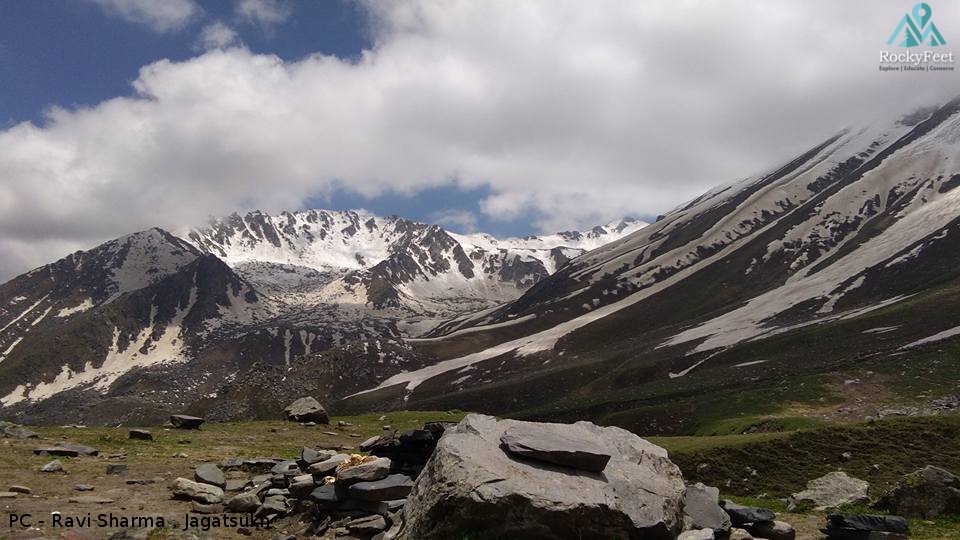 As we start our trek from Dhungri village, Manali, we enter the lush green rich and fertile eastern himalayan temperate forest on the rising slopes of Dhoula Dhar. Distant views of mount Indrasan,Deo tibba to the east and the peaks of Bara Shigri region to north-east can be seen from the trail. Alpine shrub lands, patches of grasslands start to appear.