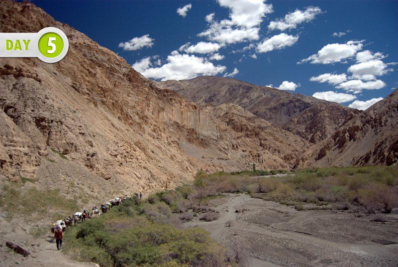 Start a little early.Leave hotel after breakfast for Spituk, 7km away. The day begins with a visit to Gelugpa sect monastery built by Lama Od-lde in the 11th century.This hill top monastery shares a wonderful view of Indus valley. Then a short drive ahead before we start. Once we are done with loading all luggage and formality of permit & red tapes, start your first day hike with a gentle walk upon vast open terrain. The trail follows the clear path and continues through easy slope keeping Indus River on right. As you come across the valley on the left, leave Indus behind and enter into the valley of wilderness. The motor-able road ends here with all signage of modern days civilization. Trek continues along the upstream small river as far as Zingchen. Our 1st camp sight.