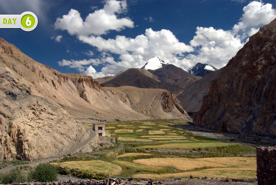 After a steep descent for around 30 mins from the Pass, the rest of the trail is gradual downhill along a dusty trail till you each the beautiful valley of Shingo Village. As you follow the trail along the Shingri Nala towards SkySkiu, the color of the mountains changes to different shades of yellow, brown red and green. The camp for the day is near to the Skiu Monastery of ancient Maitreya (Future Buddha) which is also definitely worth visiting.